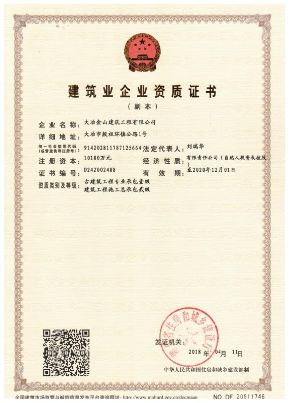 大冶金山建筑工程有限公司是一家專業從事建筑安裝總承包、園林古建筑、園林綠化景觀工程、文物修繕、市政道路工程、鋼結構工程等綜合型施工企業,公司具有資本投資運營合作實力。